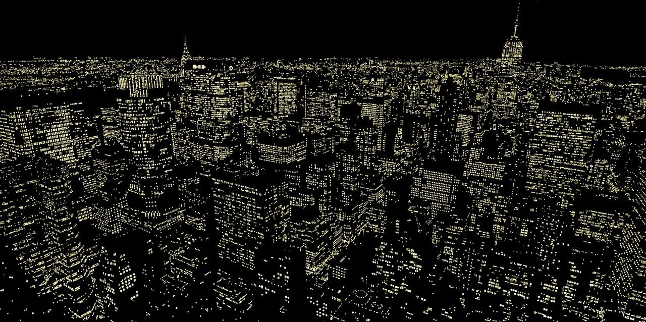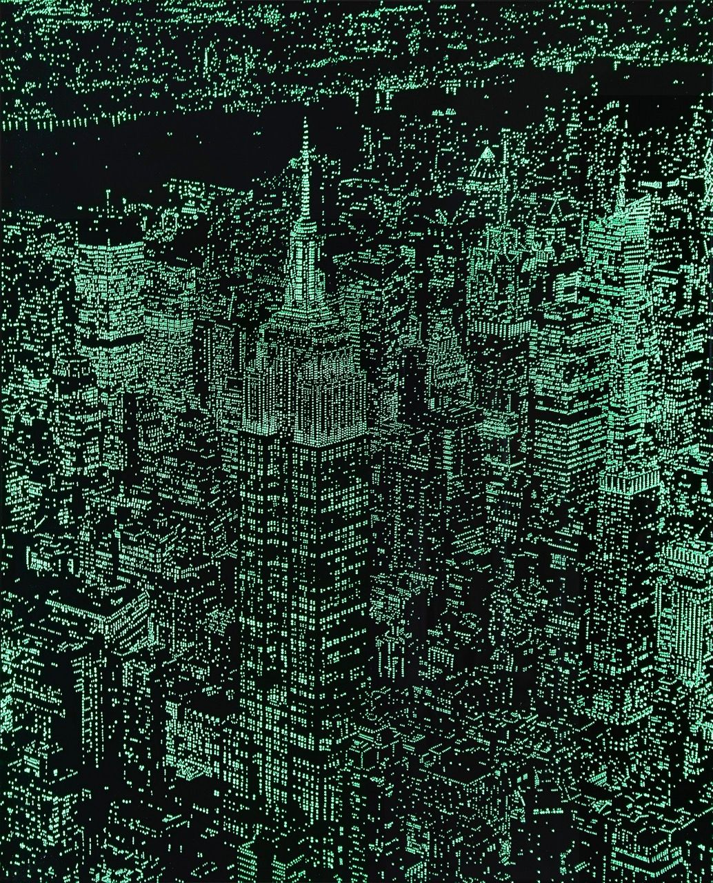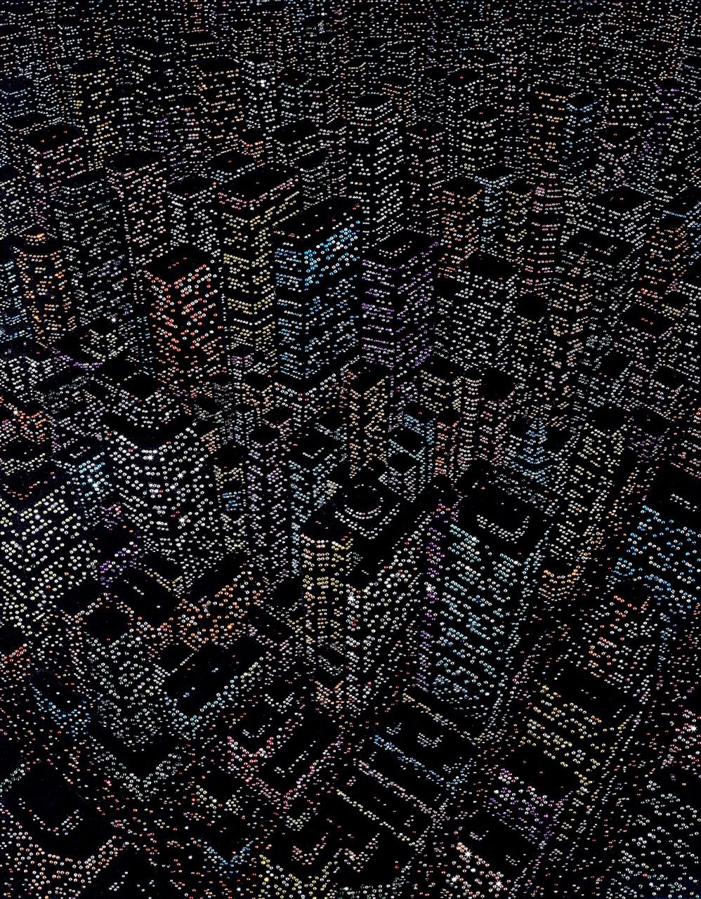 구본석은 고층빌딩의 구조와 움직임을 통해 익명화된 도시 속 인간 군상을 은유한다. 화면에 얽힌 직선들은 전기 회로처럼 복잡하게 연결되며, 그 속의 개인은 소립자처럼 미미한 존재로 표현된다. 하늘이나 지평선 없이 구성된 도시는 출구 없는 욕망의 공간이며, 이는 전통 산수화의 현대적 번안이자 황홀하면서도 허망한 도시의 이중적 풍경을 드러낸다.