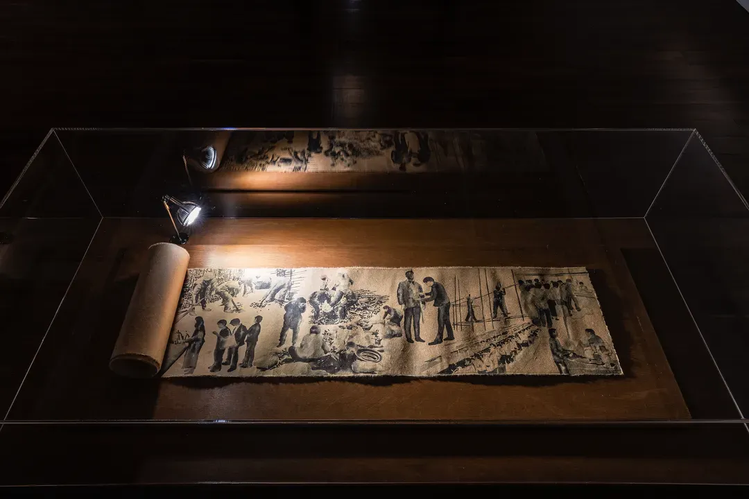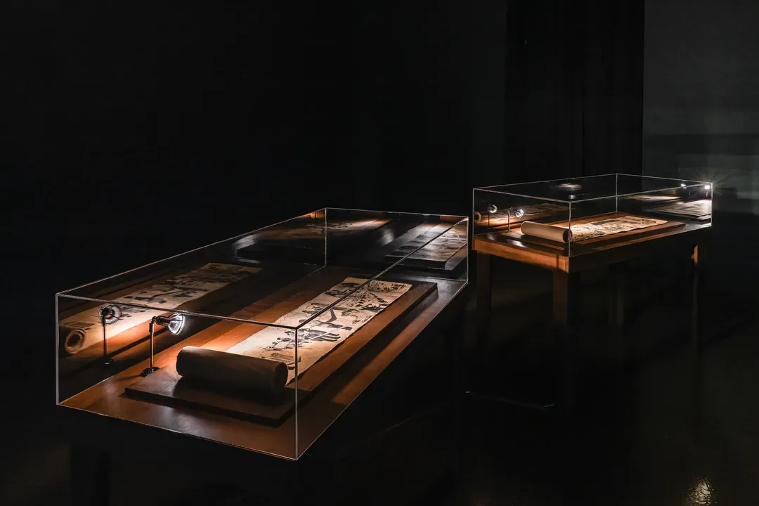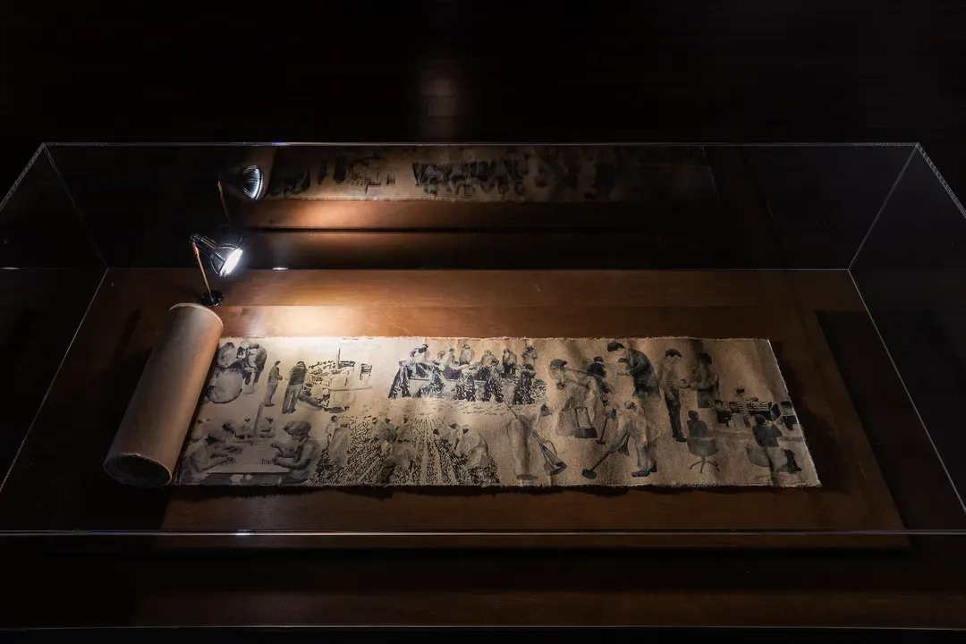 종이 위에 커피와 잉크, 나무 진열대, 아크릴 박스, LED조명