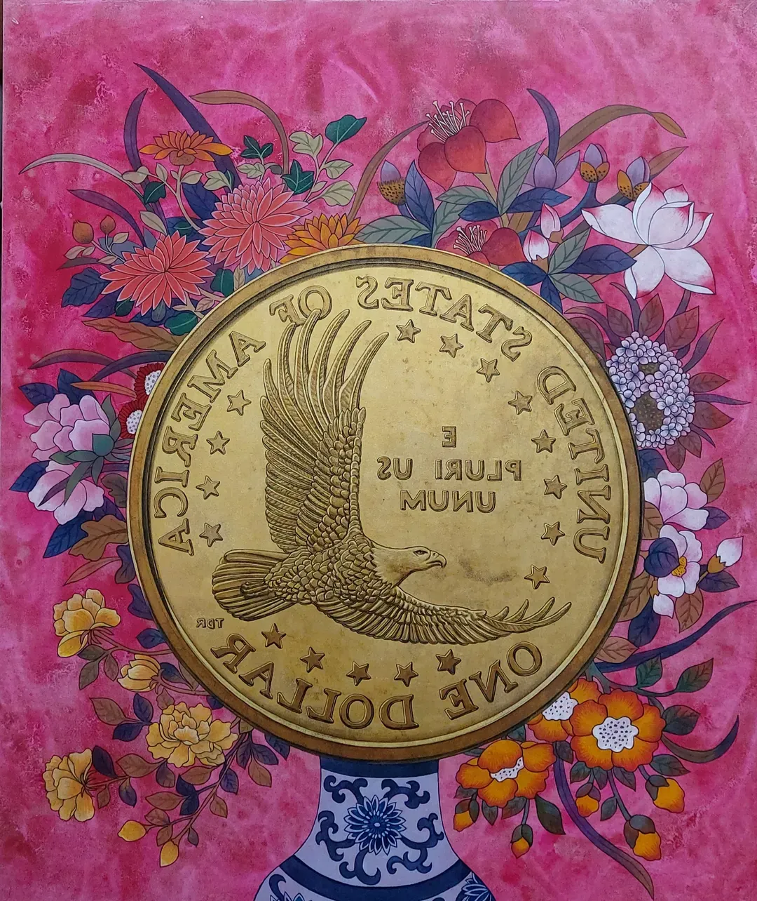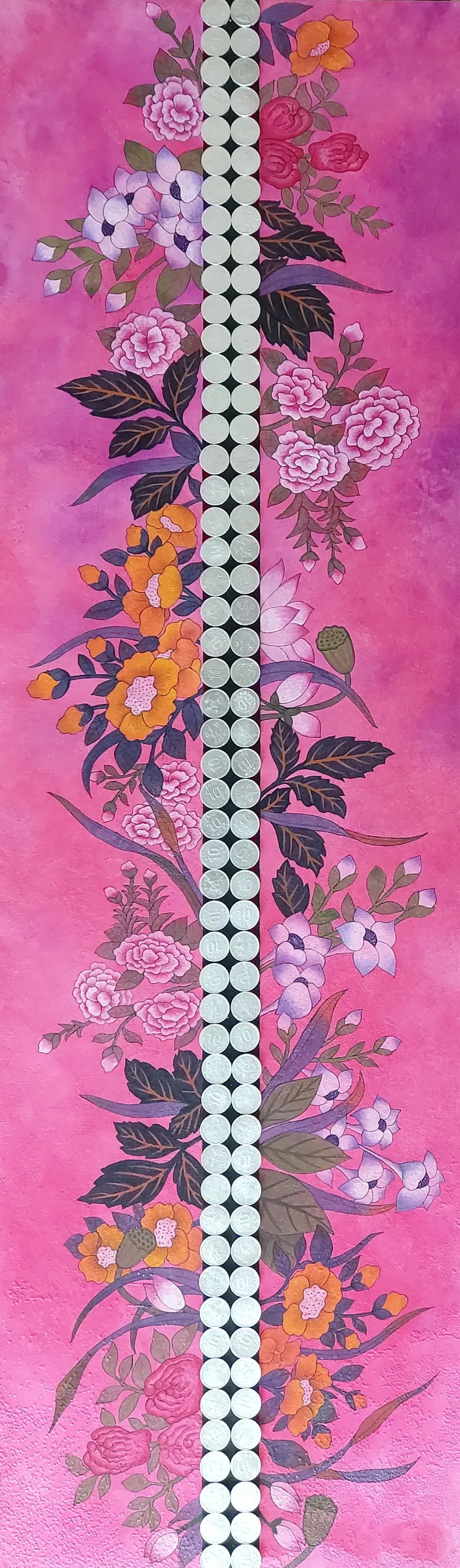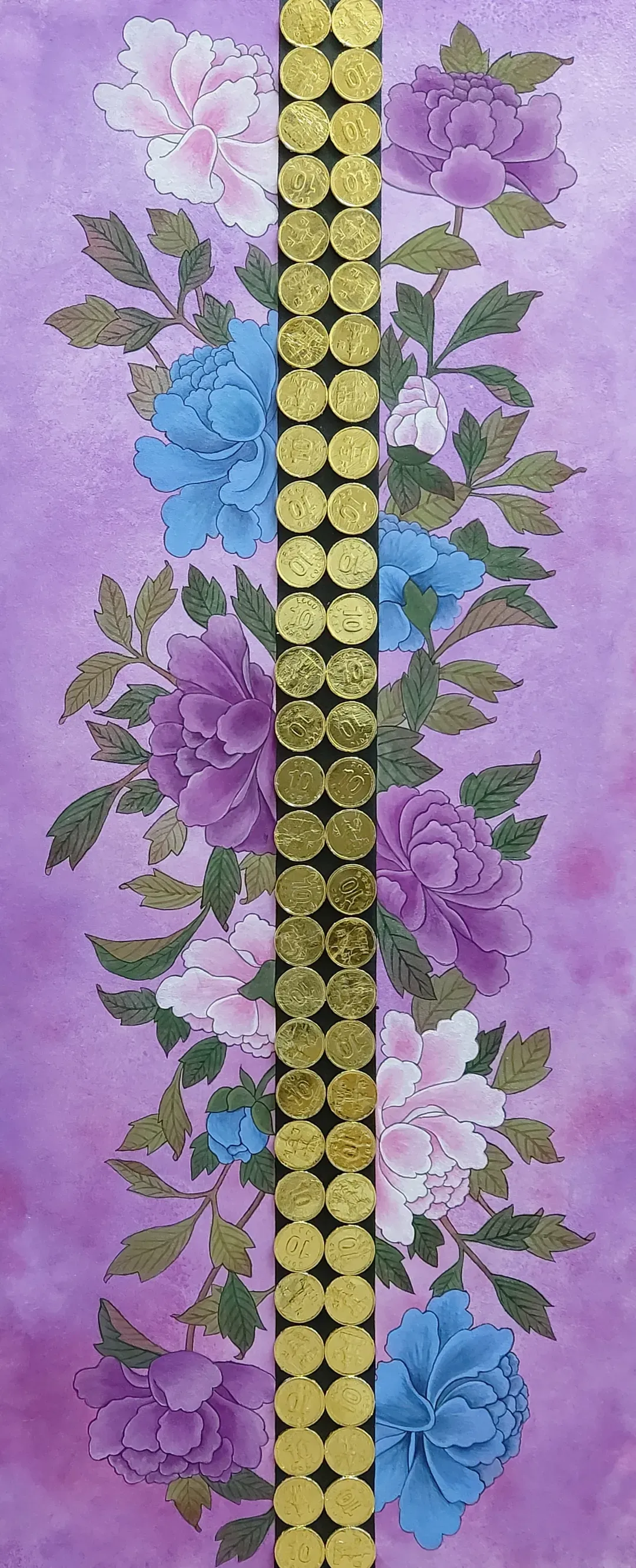 김현하는 세계 각국의 동전들을 작업에서 주요한 시각적 도상으로 다룬다. 작은 단위의 화폐에 불과하지만, 모두가 지배당하는 거대 자본주의의 또렷한 표상이기도 하다. 끊임없이 순환하는 현대사회의 자본주의 경제, 그 안에서 '과연 돈은 행복의 필수 조건인가?, 돈이 많으면 우리는 행복해질 수 있을까?'라는 물음에서 모든 작업이 시작된다. 그는 ‘동전’이라는 자본의 가장 작은 단위를 회화로 가져와 현대인에게 있어 중요한 가치와 행복의 조건에 대한 물음을 던진다. 고운 비단에 여러 번의 아교포수를 한 후, 비단의 앞면과 뒷면에 반복적으로 색을 입히는 식으로 작업이 이루어진다. 주요 개인전으로는 <흔적-비껴간 시간과 그후…>(보안아트스페이스1, 2022), <시대의 온도>(플레이스막1, 2021) 등이 있다.