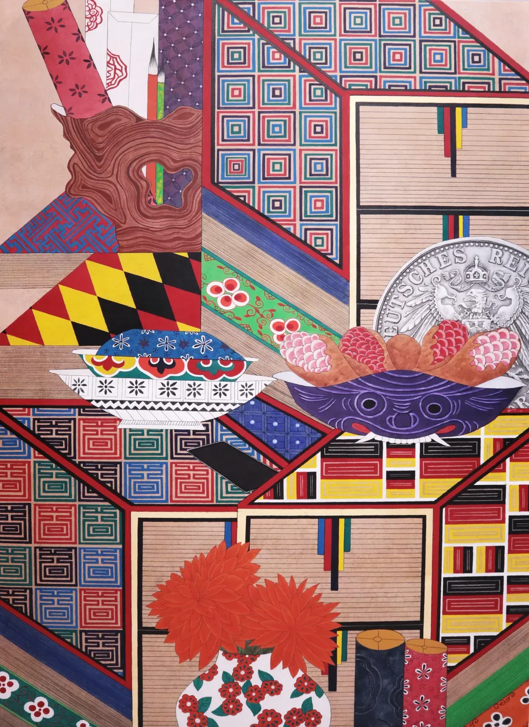 비단에 수묵채색, 혼합 재료