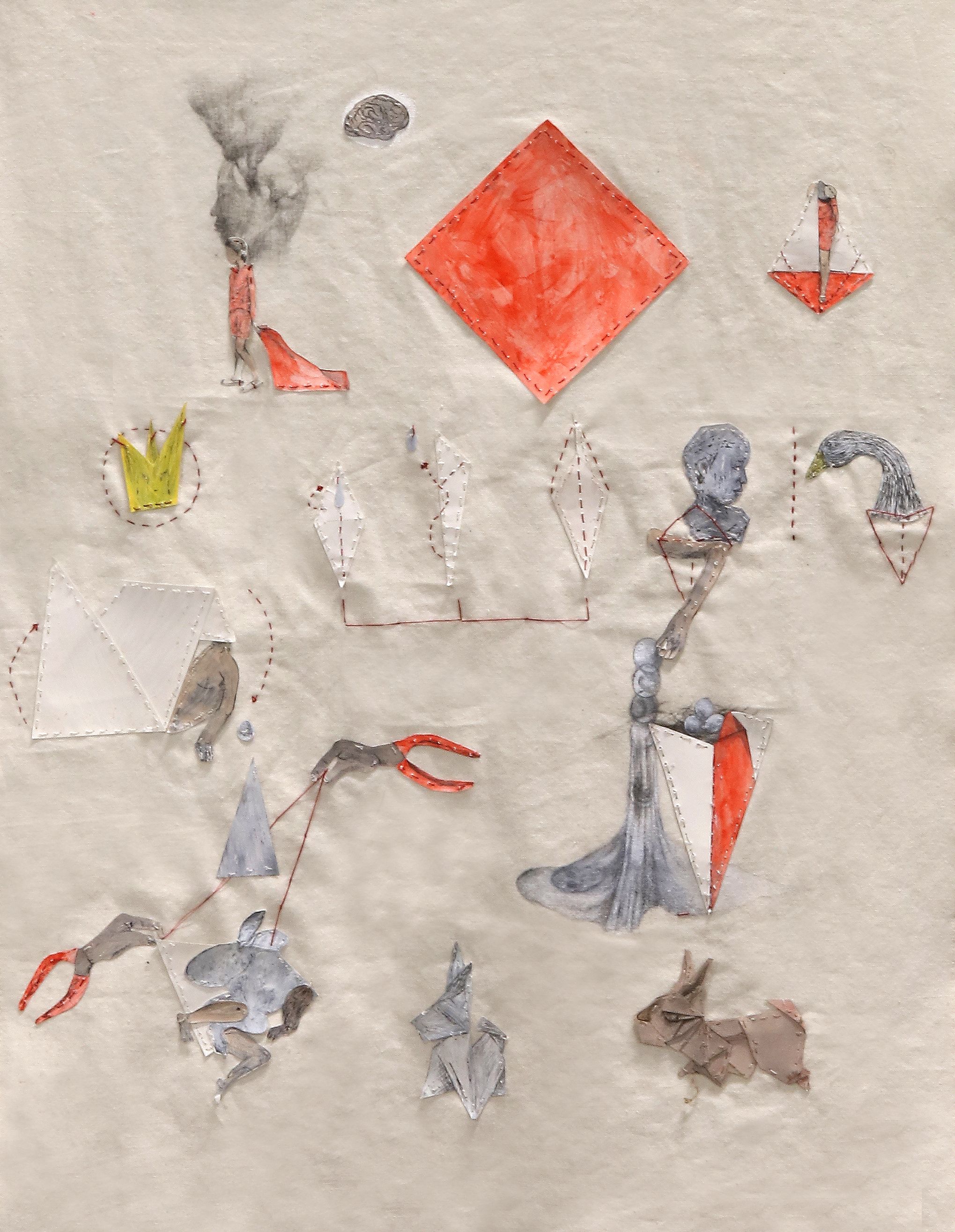 천에 연필, 채색 꼴라주, 바느질, 캔버스 천