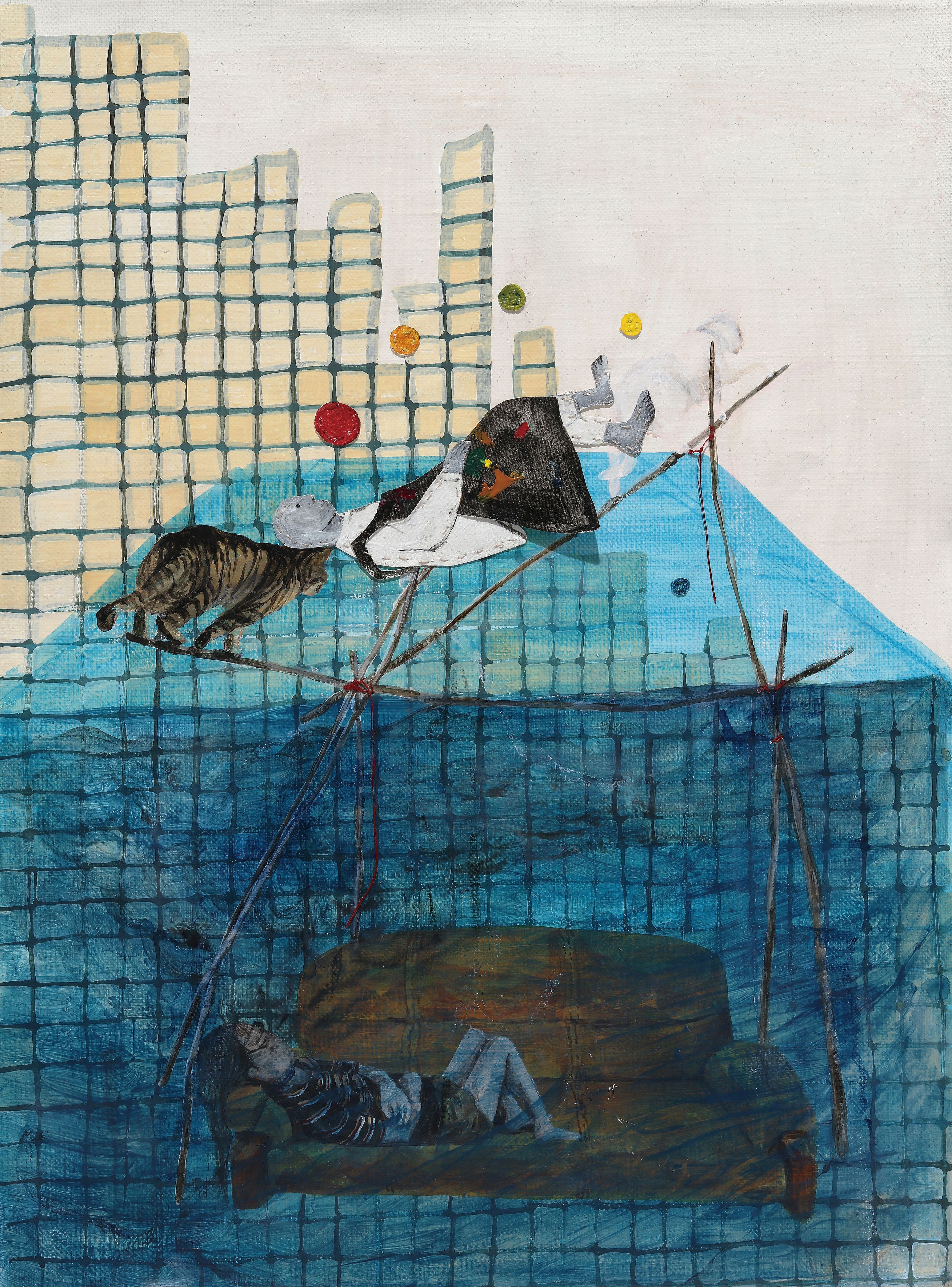 캔버스에 아크릴, 황동선, 나무조각, 철사, 실, 종이에 채색