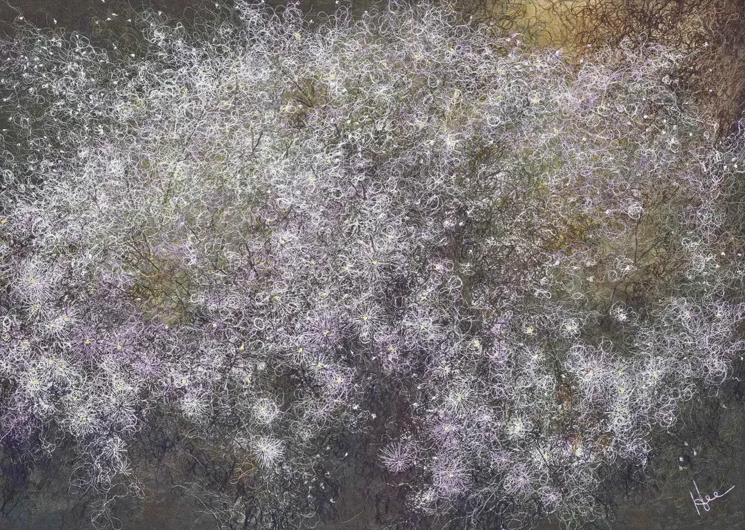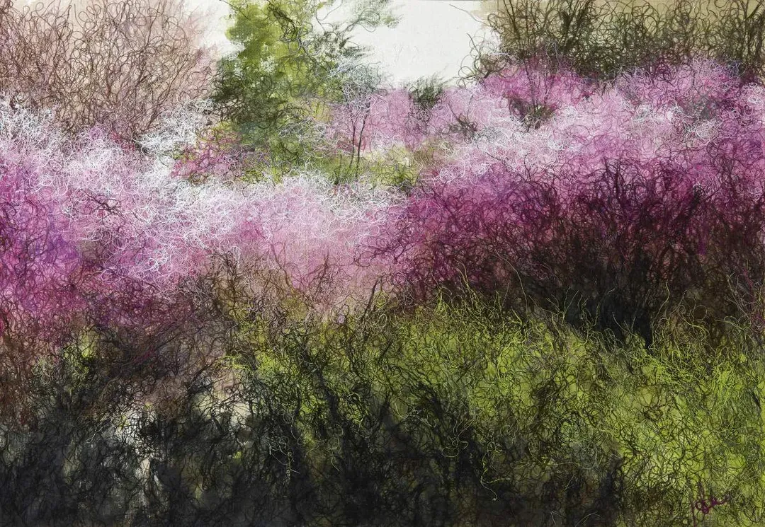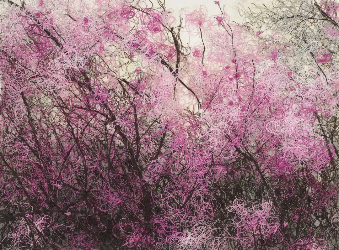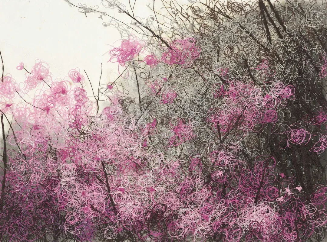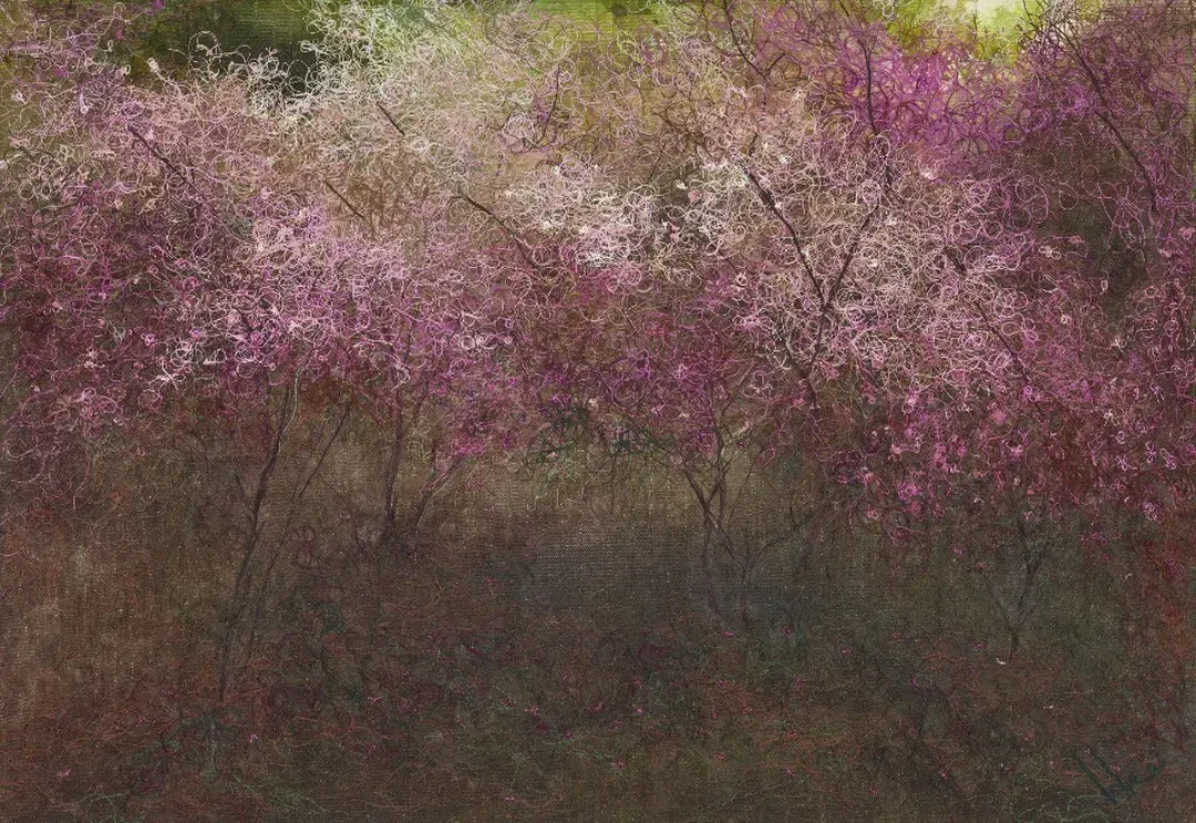 홍진희는 실을 재료로 작업하며, 물감으로는 표현할 수 없는 부드럽고 거친 질감, 미세하고 섬세한 양감을 작품에 담아낸다. 실을 쌓아올리는 반복적이고 인내가 필요한 과정을 통해, 치유와 생명 존중, 장수의 기원을 작품 세계에 녹여낸다. 그의 주요 모티프인 숲은 일상적이지만, 정신과 육체를 치유하는 장소로서, 관람자에게 따뜻함과 위로를 전한다. 실의 다양한 형태 변화와 색감은 동양적 미감과 함께 감동을 선사한다.