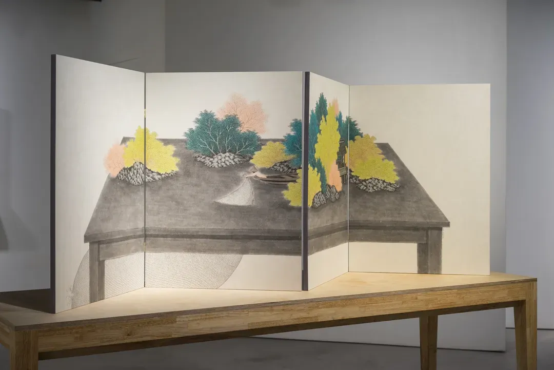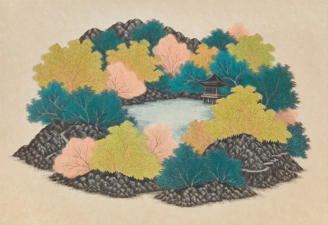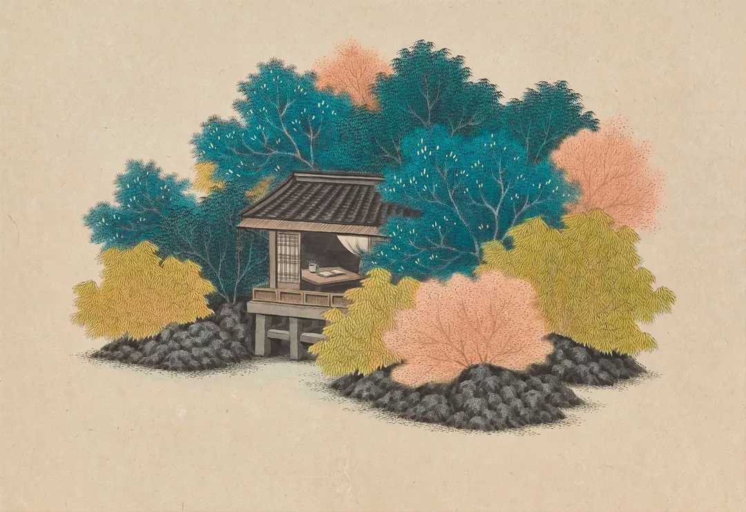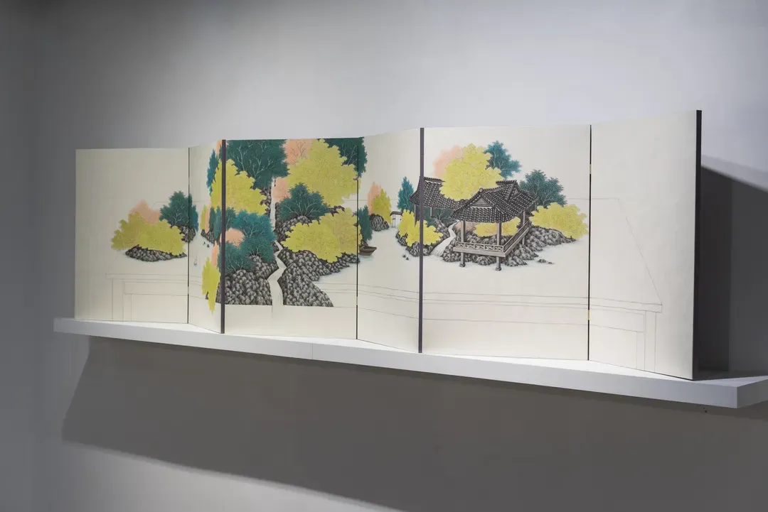 김민주는 전통 한국화의 재료와 도상을 바탕으로 일상의 공간과 산수의 이미지를 혼합해 새로운 시각적 서사를 구성한다. 화면 속에서는 자연과 현대의 사물, 인물들이 경계를 허물며 공존하고, 분해와 재조합을 통해 상상의 유희가 펼쳐진다. 작가는 서로 다른 시간과 공간이 겹쳐지는 순간을 통해 일탈의 지점을 탐색한다.