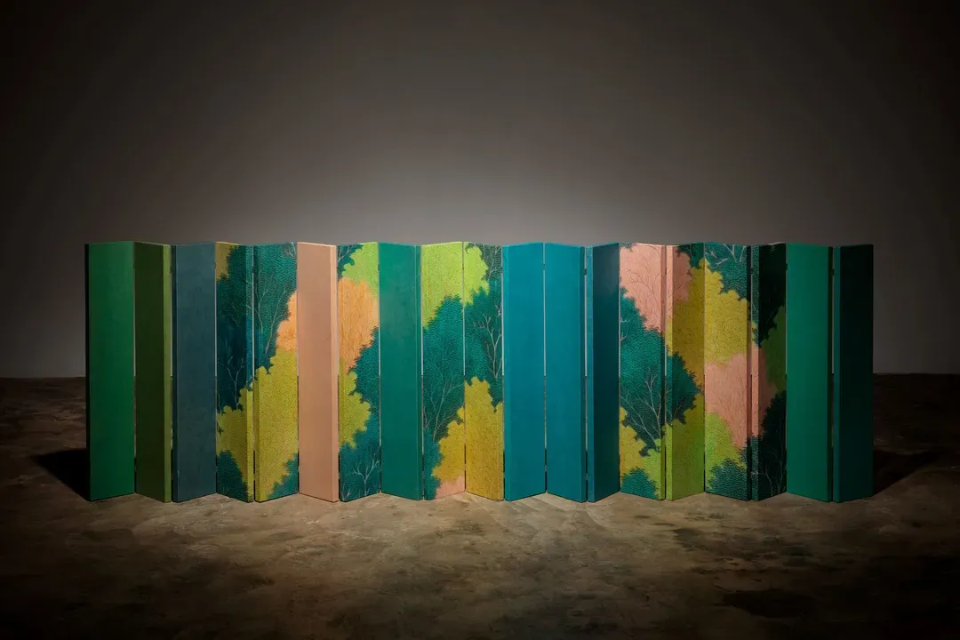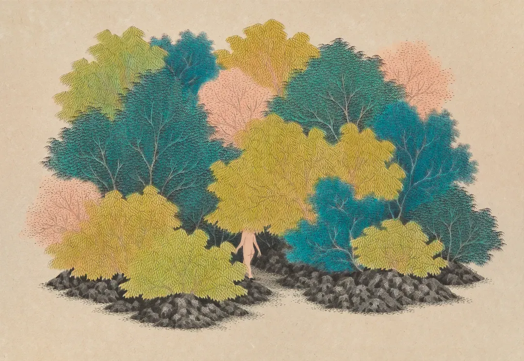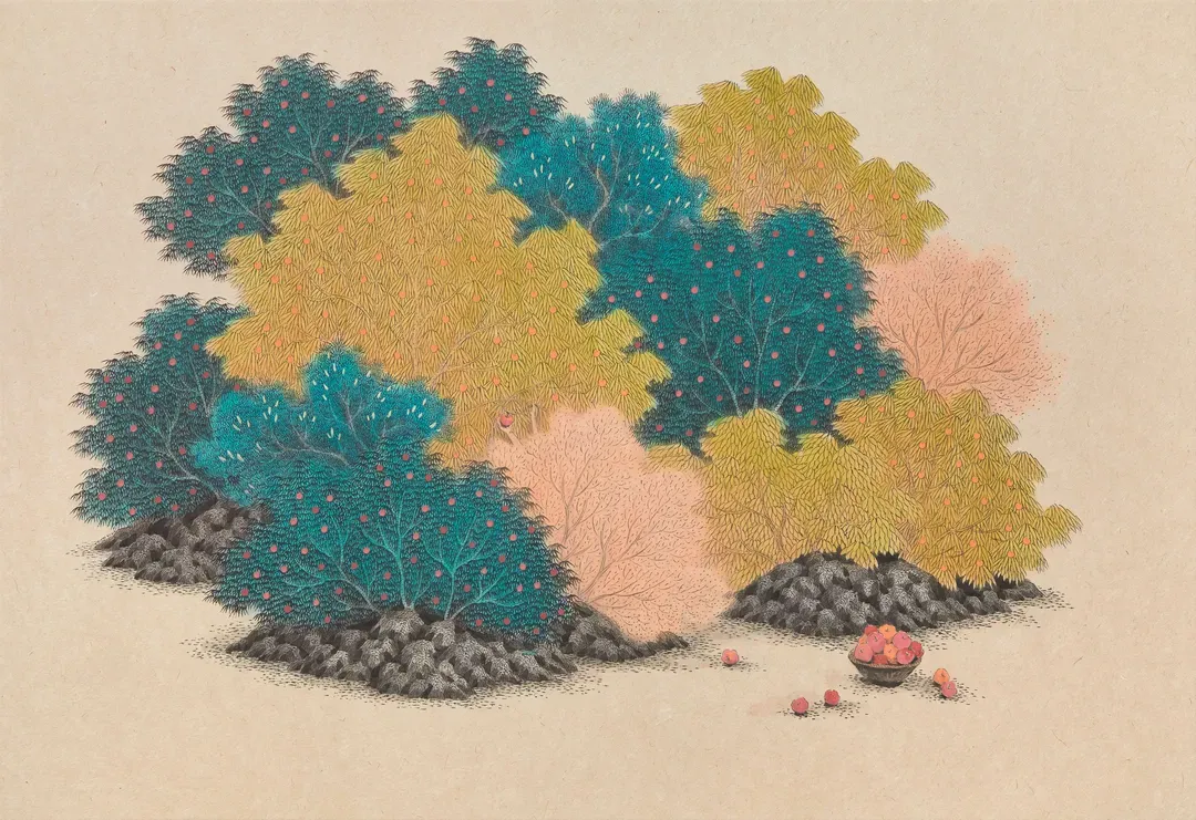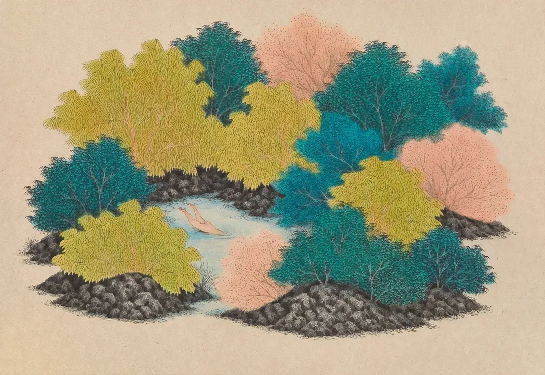김민주는 전통 한국화의 재료와 도상을 바탕으로 일상의 공간과 산수의 이미지를 혼합해 새로운 시각적 서사를 구성한다. 화면 속에서는 자연과 현대의 사물, 인물들이 경계를 허물며 공존하고, 분해와 재조합을 통해 상상의 유희가 펼쳐진다. 작가는 서로 다른 시간과 공간이 겹쳐지는 순간을 통해 일탈의 지점을 탐색한다.