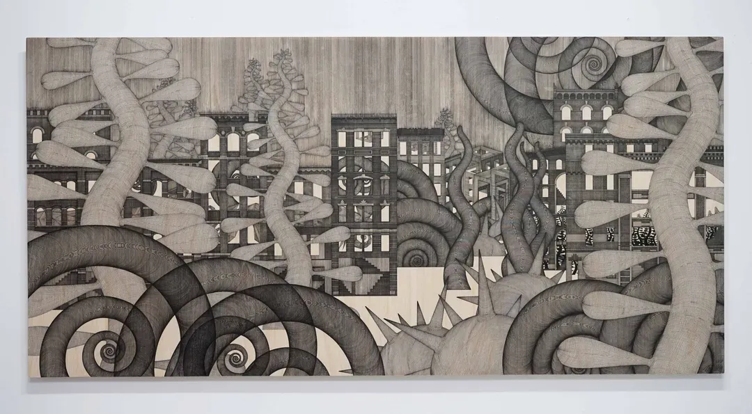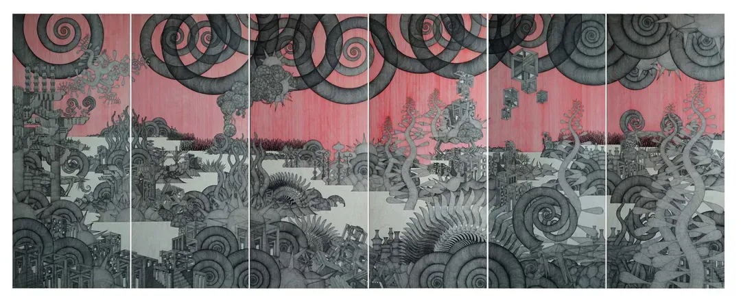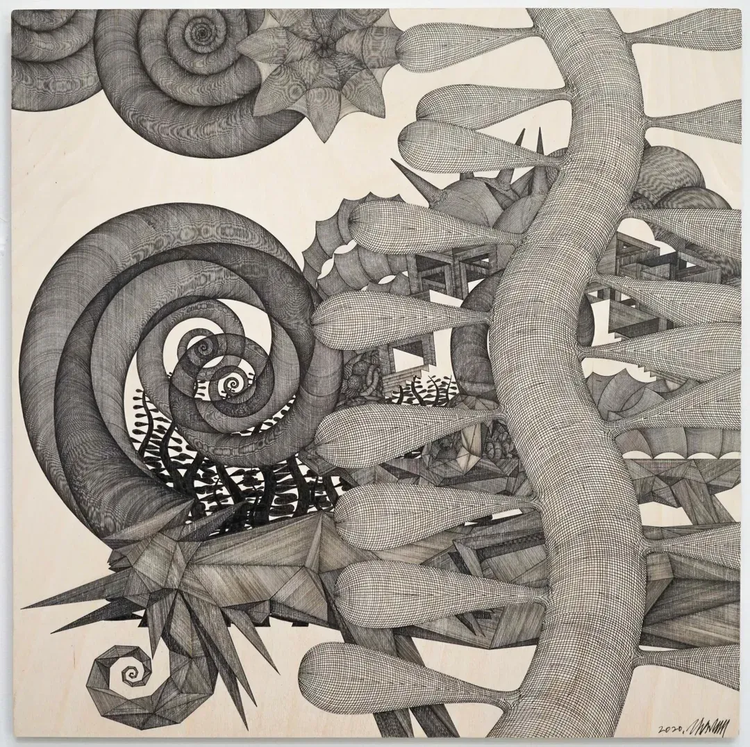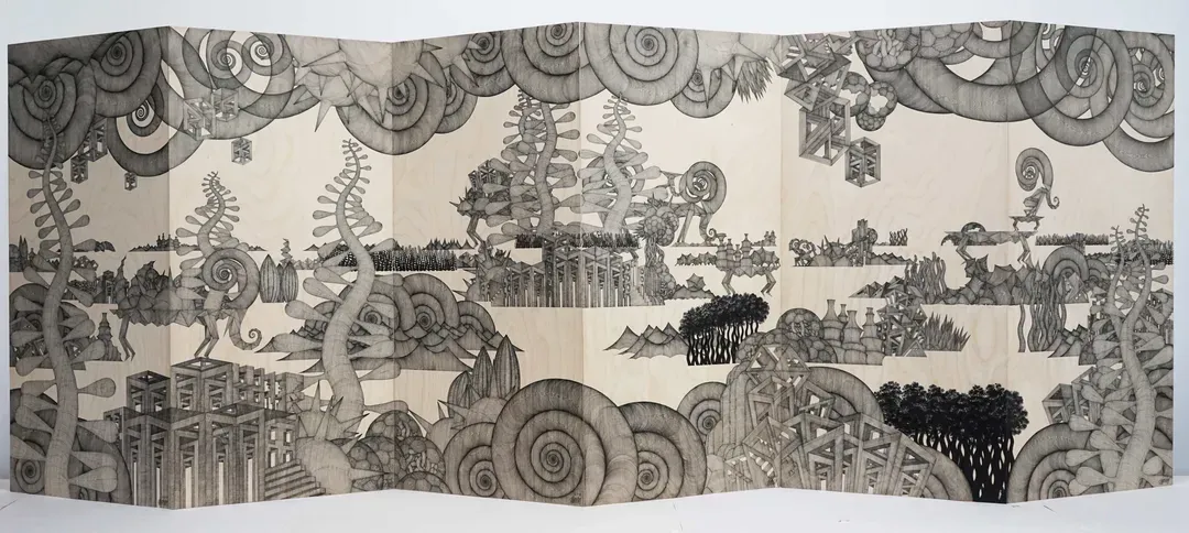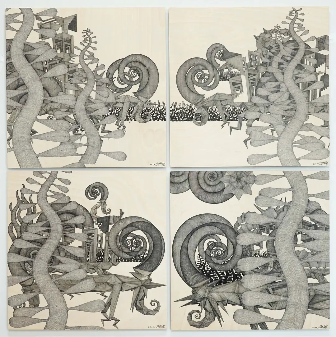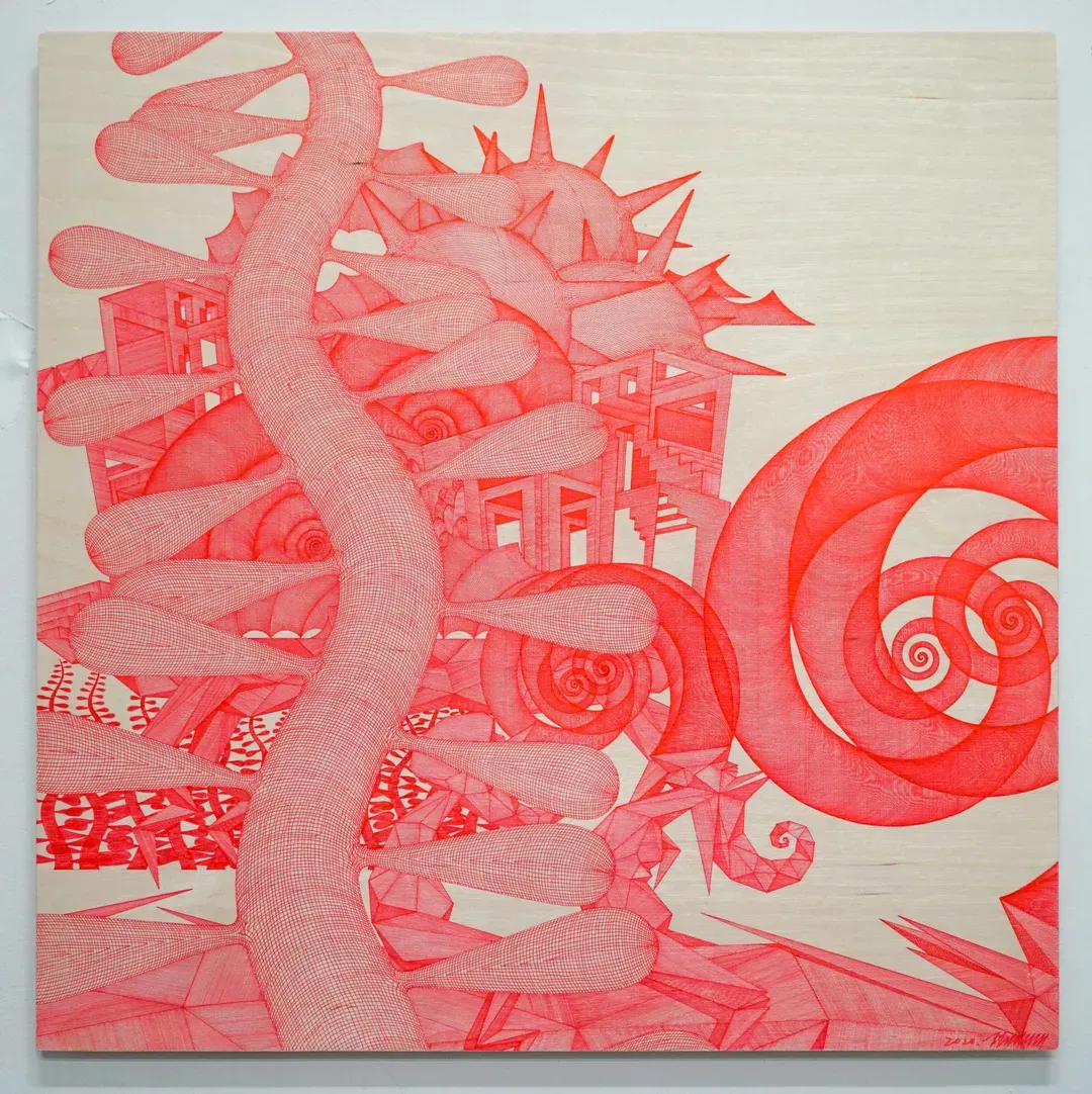 김철유는 꿈을 꾸는 상태와 그 체험을 회화로 기록하는 시각예술가다. 자신만의 논리적 특성에 따라 구축한 공간 안에서, 반복되는 직선과 곡선으로 정교하게 형상을 그려내며, 꿈의 상징성과 상상력을 융합한 독특한 이미지를 만든다. 그의 작업은 근거를 설명하기 어려운 현상과 상상의 세계를 조합해, 괴짜스럽고 유머러스하며 때로는 우주적 낯섦을 자아낸다. 김철유는 의식과 무의식, 현실과 공상이 교차하는 꿈의 메커니즘을 탐구한다.